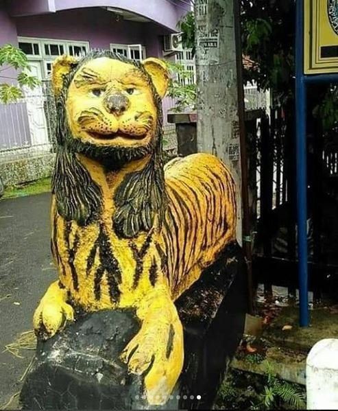 Apa komentarmu saat pertama kali kamu melihat sosok patung macan ini? Apakah mirip dengan harimau ataukah ini singa, atau malah macan jadi-jadian?
