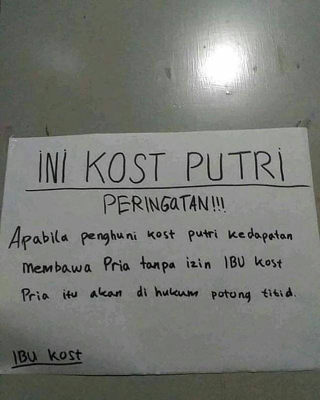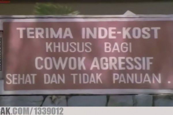 Sebuah pengumuman di kos-kosan ini menunjukan kriteria bagi pria yang mau menyewa kamar kos. Sebab hanya pria-pria yang agresif, sehat, dan tidak panuan yang boleh menyewa kamar kos. Kenapa harus ada pria yang tidak panuan ya?