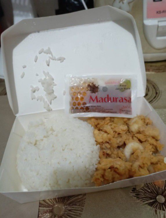 Namun yang bikin terkejut adalah penampakan madu saset yang berada di dalam kotak nasi tersebut. Ya, madu instan umumnya dikonsumsi secara langsung, bukan untuk masakan. Tapi si penjual makanan cuma goreng tersebut malah memberikan madu saset dalam menu makanannya.