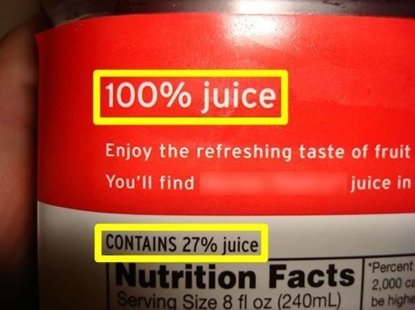 Ada lagi nih orang jualan jus, tag linenya 100% juice eh malah tabel kemasannya contains 27% juice, terus 73 sisa lainnya isi apa ya? Isi air? Apa diisi dengan semangat kemerdekaan?