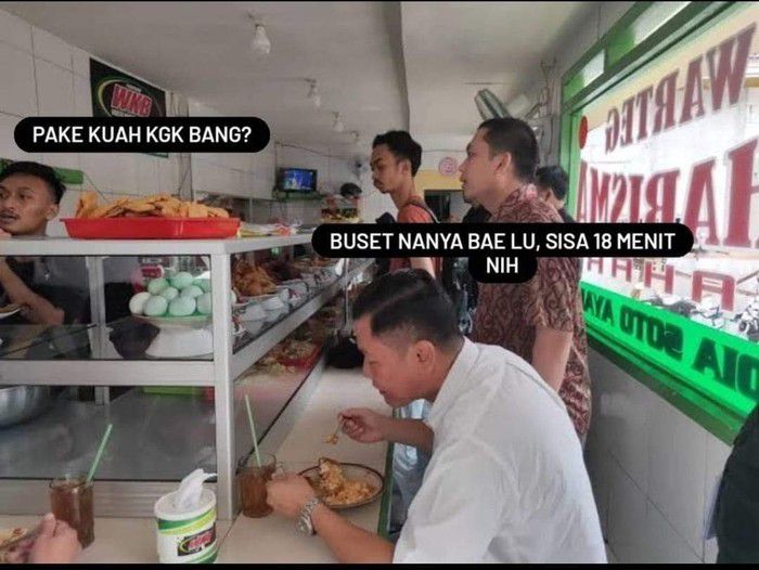 Foto Gubernur DKI Jakarta, Anies Baswedan sedang makan di warteg juga dijadikan bahan meme lho. Bayangkan orang nomor satu di Jakarta ini diburu-buru ketika sedang makan karena waktunya maksimal 20 menit.