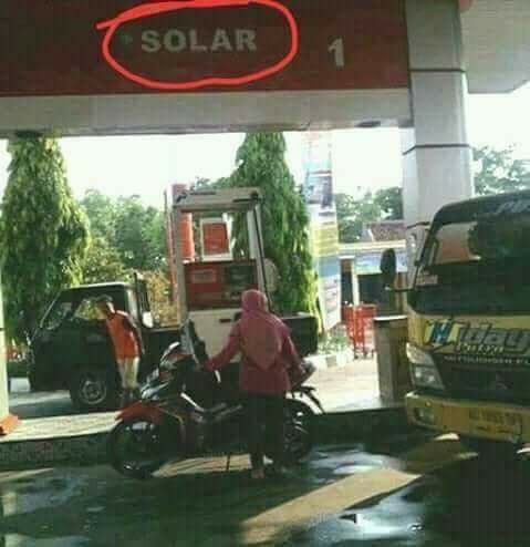 Rupanya bahan bakar semakin menipis ketika sedang berkelana menyusuri jalanan. Karena biasanya antrean motor lumayan panjang dan akan membuang waktu si emak, mumpung ada antrean yang kosong, langsung saja, deh! Eh, tapi itu solar, lho, Mak!