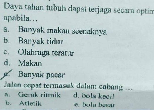 Didalam soal tersebut tertulis, "pertanyaan Daya tahan tubuh dapat terjaga secara optimal apabila..."
