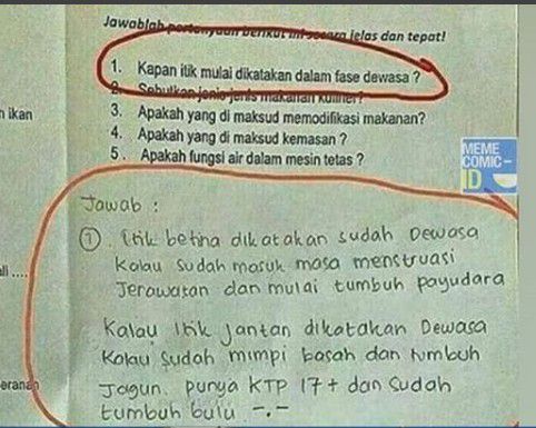 Ada aja kelakuan murid yang sangat kreatif dan pintarnya kebablasan, di soal itu kan tertulis, "Kapan itik mulai dikatakan dalam fase dewasa?" ya sontak jawabanya ini yang bikin ngakak.