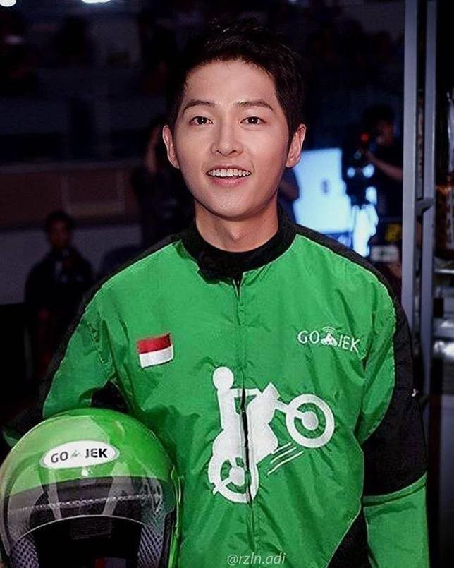 Pesona si tampan Song Joong Ki memang tak tertandingi. Mau pakai pakaian apapun kayaknya dia tetap rupawan deh. Coba tengok ketika duda keren ini pakai jaket driver ojol sambil menenteng helm hijau, ganteng banget. Kira-kira bakal berebutan kayaknya yang mau diantar dia.