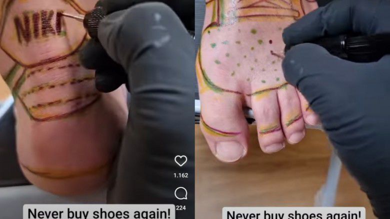 Sebelum membuat tato permanen, pemilik studio tato DG Tattoo Art, di Manchester ini menggunakan tinta sementara agar hasilnya sesuai dengan sepatu Nike kesukaannya. Tidak disangka, pelanggan tersebut beralasan mentato kakinya dengan gambar sepatu karena bosan.