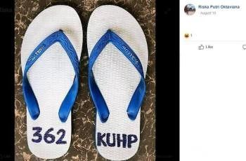 Tulisan di sandal jepit berupa pasal 362 KUHP tentang tindak pidana pencurian, membuat maling sandal akan berpikir dua kali saat hendak mencuri sandal itu.