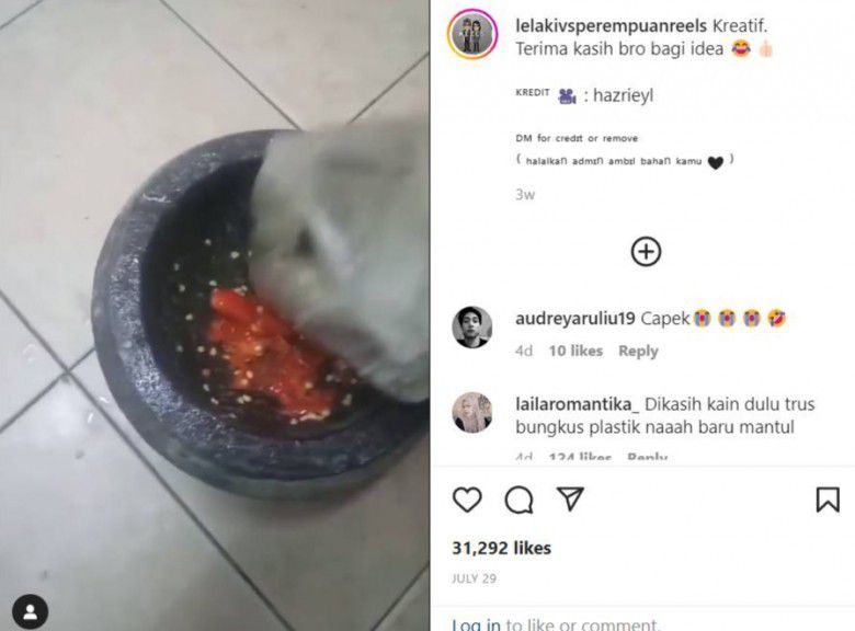 Video yang diunggah akun Instagram @lelakivsperempuanreels memperlihatkan seorang pria yang sedang sibuk menghaluskan sambal dengan cara aneh.