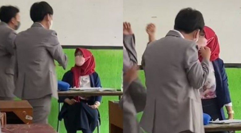 Saat kedua siswa menghadap ke sang guru untuk minta izin ke toilet, mereka ternyata langsung terciduk. Sang ibu guru langsung berdiri saat dua siswa tersebut ingin berjabat tangan.