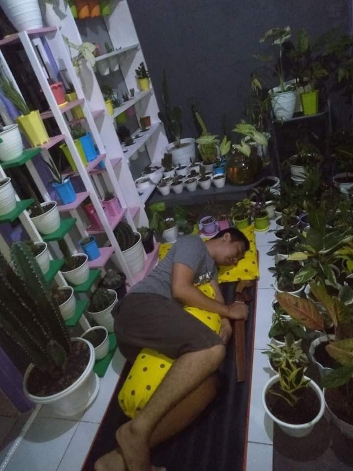 Para suami ini rela tidur bersama tanaman-tanaman hias. Tentu tujuannya agar tanaman tersebut tidak dicuri orang. Bahkan di antara mereka, ada yang sampai membawa golok lho.