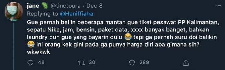 @tintoura : Gue pernah beliin beberapa mantan gue tiket pesawat PP Kalimantan, sepatu Nike, jam, bensin, paket data, xxxx banyak banget, bahkan laundry pun gue yang bayarin dulu tapi ga pernah suru doi balikin. Ini orang kek gini pada ga punya harga diri apa gimana sih? wkwkwk