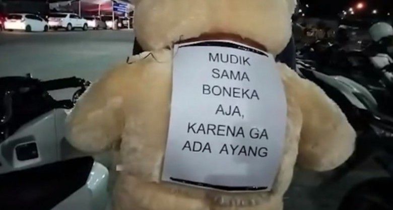 Di boneka beruang itu terdapat tulisan yang menarik perhatian pemudik lain dan juga warganet. Tulisan itu berbunyi "Mudik sama boneka aja, karena ga ada ayang." Sontak video pria itu pun menjadi viral.