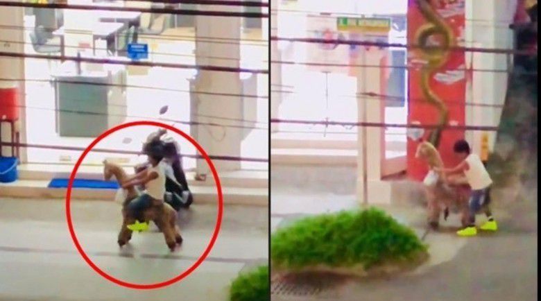 Dalam video tersebut terlihat seorang bocah yang lagi naik kuda-kudaan saat belanja ke warung. Bukannya naik sepedahan seperti bocah pada umumnya, eh dia malah naik kendaraan yang nggak biasa. Ada-ada saja….