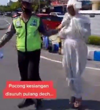 Seorang Polisi di Ngawi, Jawa Timur terlihat menilang seorang yang tampil seperti hantu Pocongdi sebuah jalan. Bukan malam hari tapi Polisi menilangnya pada siang hari. Memang apa yang dilakukan orang itu?