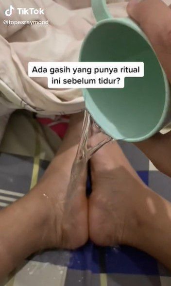 Melalui akun @topesraymond, warganet itu menunjukkan hal yang gak biasa sebelum tidur. Ya, pria tersebut malah membawa segayung berisi air ke atas kasurnya, lalu menyiramnya di bagian kaki. Katanya, cara itu sengaja dilakukan biar kasurnya punya sensasi dingin.