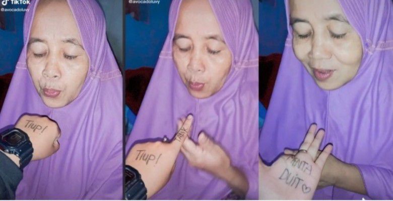 Saat di lihat, bukannya berisi barang atau uang, telapak tangannya malah bertuliskan, ‘Minta Duit’ dengan tanda berbentuk cinta.
